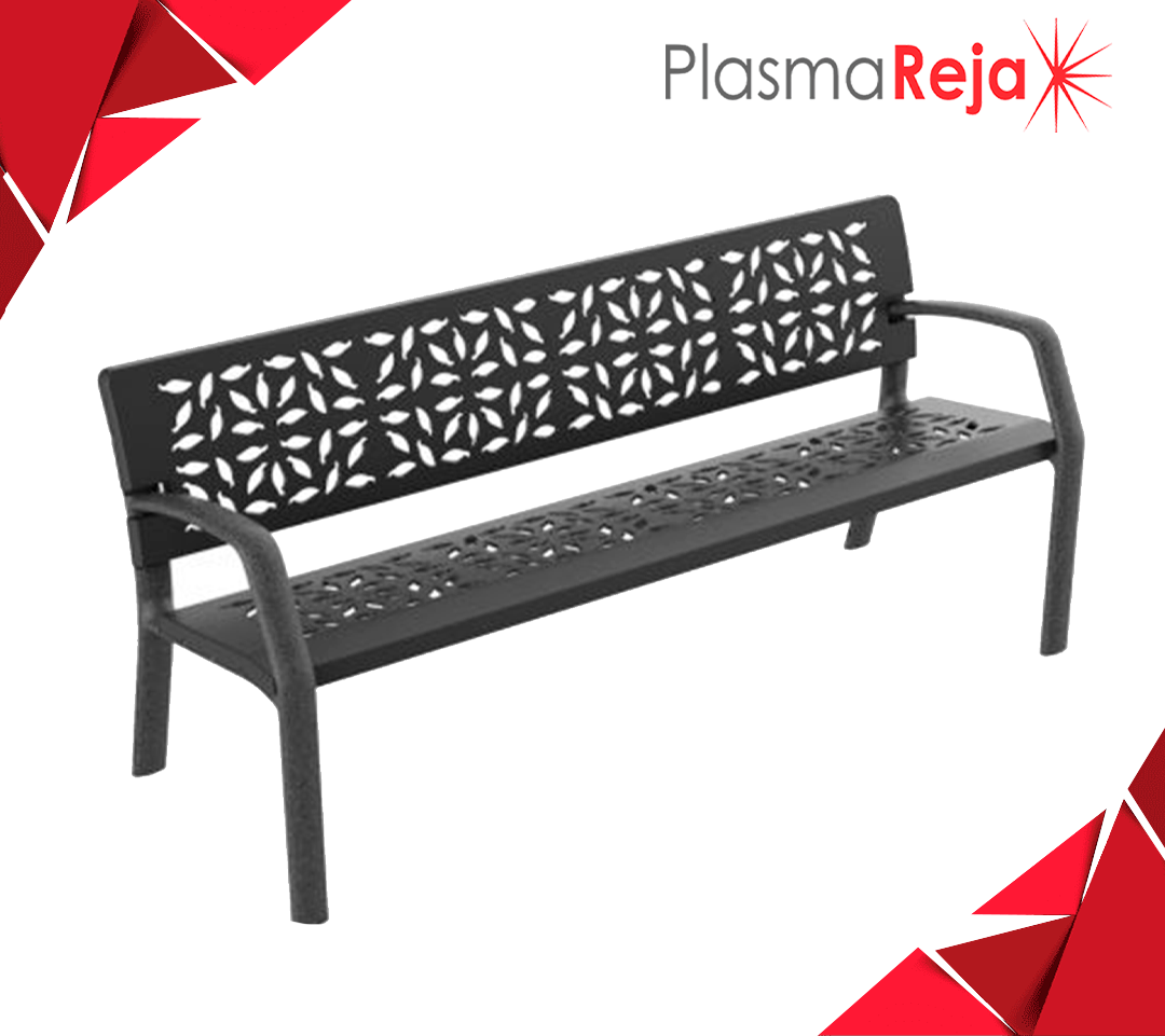 Banca metálica a base de acero al carbón en corte laser, marca "D'hierro" modelo PLS-110, con acabado en pintura electrostática en polvo horneada de alta resistencia a la intemperie, con pretratamiento de fosfato de zinc para anclar o ahogar en concreto.