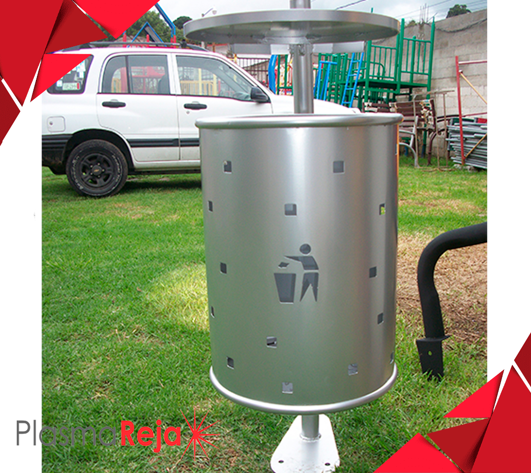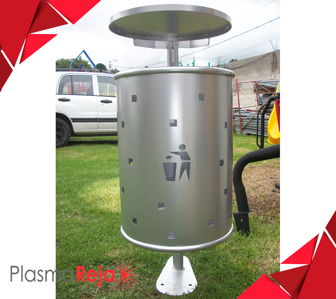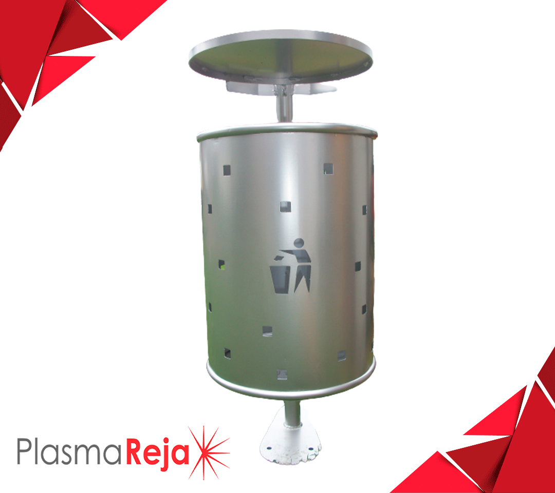 Contenedor para basura elaborado a base de lámina calibre 16 y tubo redondo de 1.5”, corte por plasma. Uso rudo con acabado en pintura electrostática horneada de alta resistencia a la intemperie, con pretratamiento de fosfato de zinc.