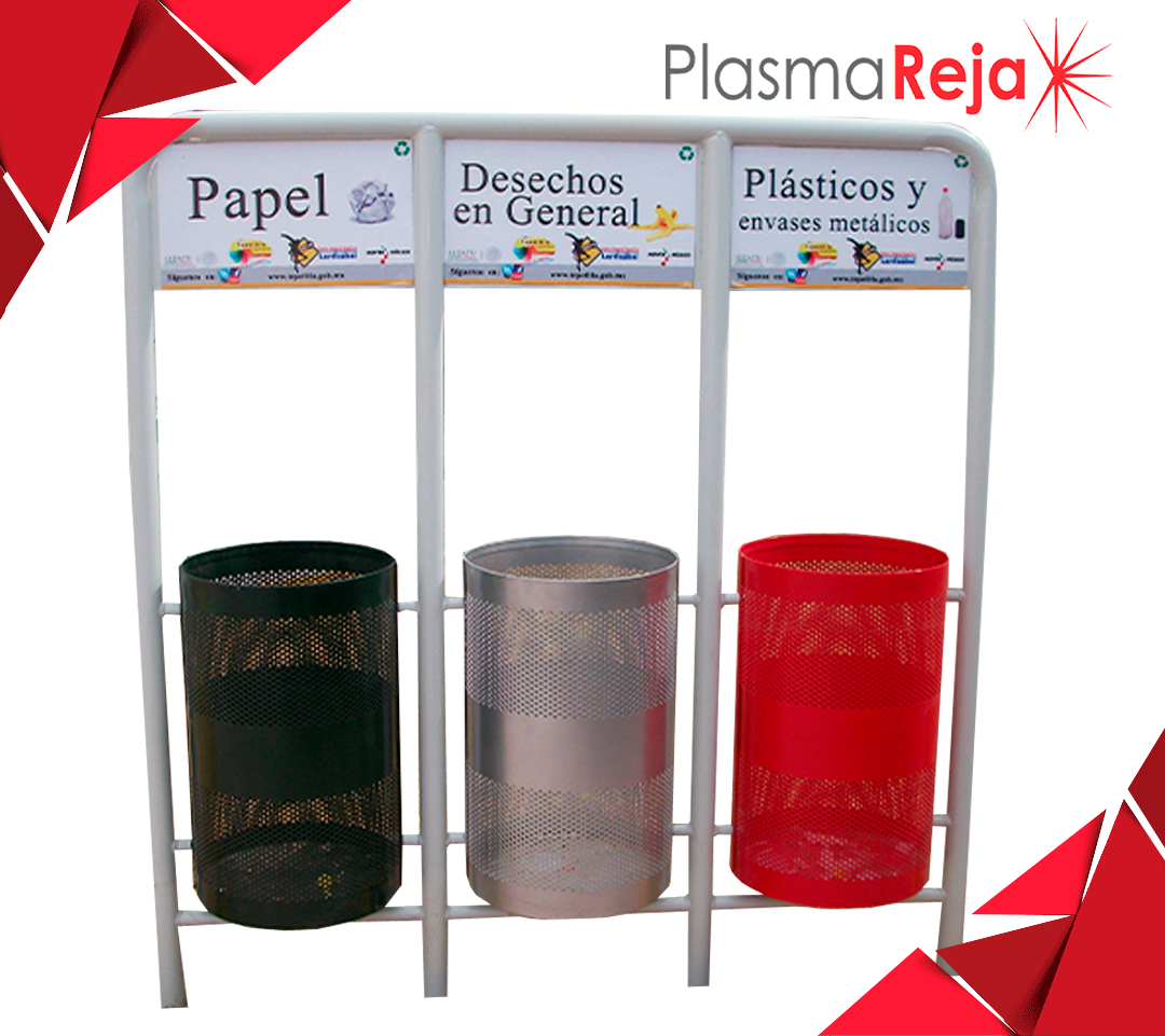 Contenedor para basura elaborado a base de lámina calibre 16 y tubo redondo de 1.5”, corte laser. Uso rudo con acabado en pintura electrostática horneada de alta resistencia a la intemperie, con pretratamiento de fosfato de zinc.