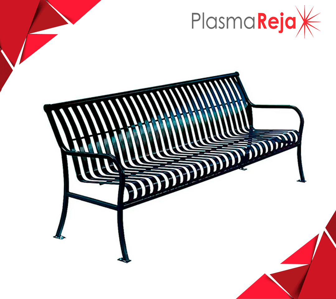 Banca metálica a base de acero al carbón en corte laser, marca "D'hierro" modelo BSD-03, con acabado en pintura electrostática en polvo horneada de alta resistencia a la intemperie, con pretratamiento de fosfato de zinc para anclar o ahogar en concreto.