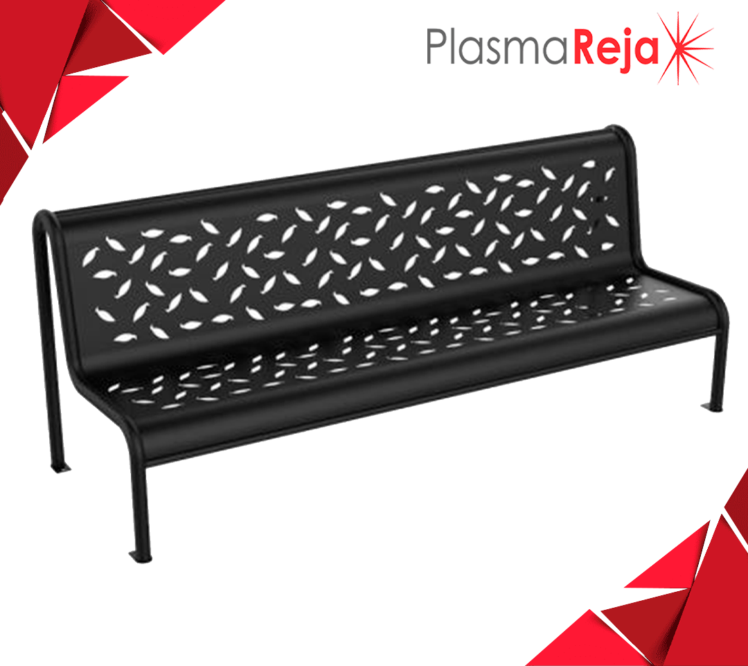 Banca metálica a base de acero al carbón en corte laser, marca "D'hierro" modelo ZAC-035, con acabado en pintura electrostática en polvo horneada de alta resistencia a la intemperie, con pretratamiento de fosfato de zinc para anclar o ahogar en concreto.