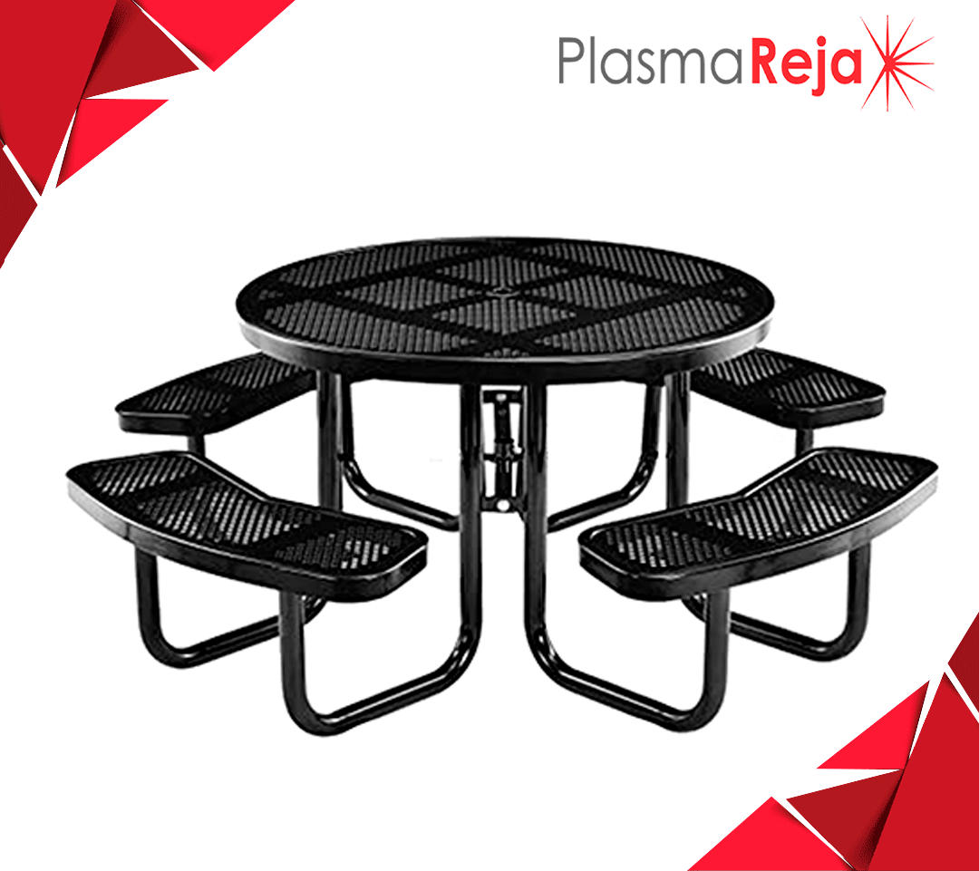 mesa de picnic marca d'hierro modelo pc-015, redonda, con cubierta de malla y acabado en pintura en polvo horneada de alta resistencia a la intemperie, con pretratamiento de fosfato de zinc.